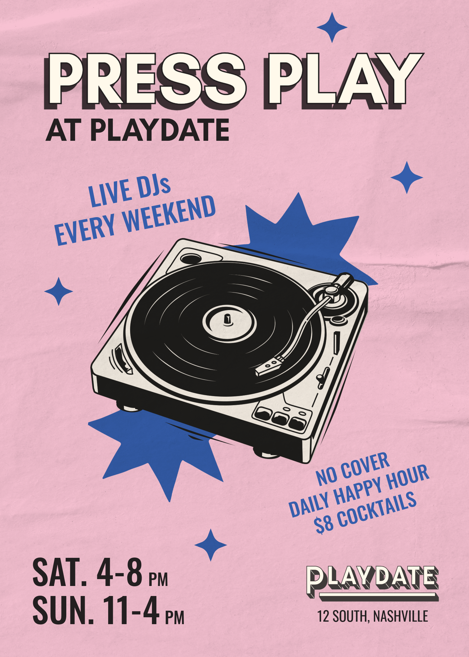 Looking for the best weekend DJ party in Nashville? Head to Playdate for Press Play, our high-energy DJ party happening every Saturday from 4–8 PM and Sunday from 11 AM–4 PM. Whether you're getting your Saturday pre-party started with great music and friends or recovering at Sunday brunch with a DJ spinning crowd favorites, Press Play delivers the ultimate weekend vibe. Plus, enjoy $8 cocktails all day, making it the perfect spot to sip, dance, and keep the good times going. With great music, brunch, drinks, and an electric atmosphere, Press Play at Playdate is one of the best weekend parties in Nashville.
